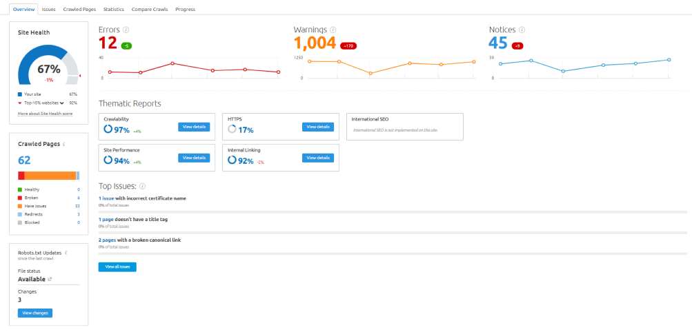 • Technical audit : Check robots.txt, sitemap, crawl issues, indexing and content duplication
