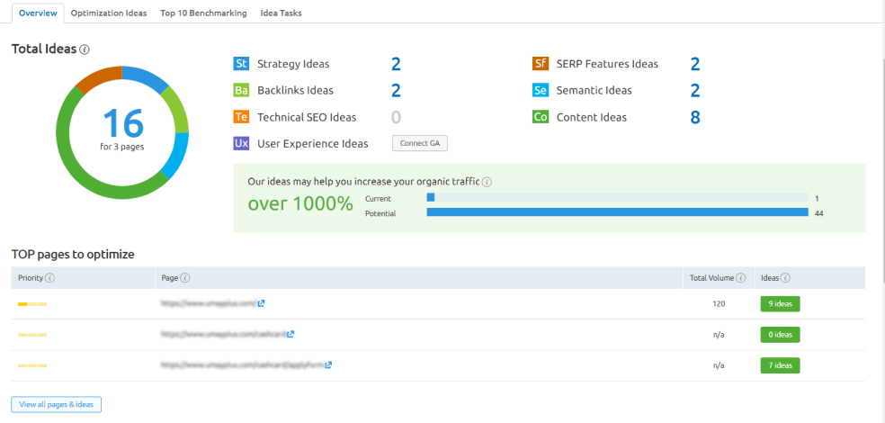 Depending on the idea for which you want more information, this report will provide you with comprehensive data for a given landing page by comparing the page to the results collected from your top 10 competitors. The assessment will cover the following aspects :